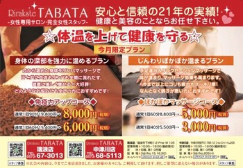 【岐阜県】【瑞浪市】【土岐市】 予防医学に基づく健康と美容の専門店 Rirakste TABATA 瑞浪店「リラクステタバタ」 【下沖町】【土岐市】【創業23年】【女性限定】 女性の様々な悩みに『田畑流』技術にて全力全開でお応えしております。スタッフの本気さを感じて頂けると思います。 女性スタッフによる、女性専用のサロンです。人目が気にならない、隠れ家的なサロンです。(※場所がわかりにくい時はご連絡ください) 「全ての女性の笑顔の為に」☆研究し続け23年、独自の技術『田畑流』超技術で、施術致します★何処へ行っても、何をやっても、何度トライしても、上手くいかなかったダイエットや疲労回復・身体ケアや妊活などでお悩みの方に、全力でサポートし、マタニティの方も専用メニューで心地よくご来店頂けます。 骨盤が気になる方にも骨盤をしっかり丁寧にお手入れします。疲労感が気になる方!疲労を芯から絞り出し全身の疲れを緩和してくれます♪ ぜひ、一度足を運んでみてはいかがですか??