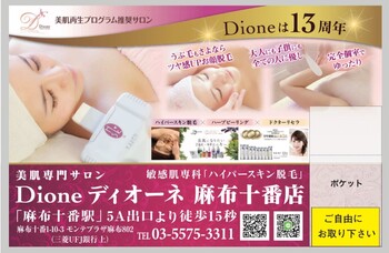 美肌脱毛サロン「Dione麻布十番店」は第10回エステグランプリでは顧客満足サロン部門で優秀サロンに選ばれた実力派。 ◆【お部屋の内装】は6帖~の広めの個室になっておりますのでゆったりお過ごしいただけ、またお子様とご一緒にご来店頂きましてもリラックスしてお待ちいただく事ができます。さらにお子様と一緒に施術の場合は貸し切りも可能となっておりますのでプライベート空間としてご利用いただく事ができます。親御様のお待ちいただくスペースもご用意がありデスクにてお仕事されながらお待ちいただく事も可能となっております。 ◆【お車でお越しの方】は麻布十番公共駐車場と提携がございますので格安チケットにて時間に急ぐことなくお過ごしいただく事ができます。 ◆【電車でお越しの方】都営大江戸線・東京メトロ南北線 麻布十番駅5a出口を出て、左に東京三菱UFJ銀行があるビルになります。三菱UFJ銀行とローソンの間にビルの入り口があります。そちらから、お入り頂き、802をお呼び出して下さい。オートロックを開錠致します。