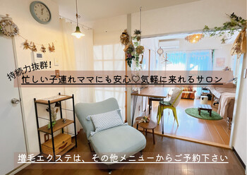 店内はアットホームな雰囲気で、子連れママに好評☆ お仕事や家事・子育てで日々忙しい女性の味方! 自分でつけるエクステ講座も有り♪ お客様のライフスタイルに合わせて、ご活用頂けます❗ 当店のオススメメニューは、〚持続力抜群のぱっちりボリューム時間無制限の付け放題 〛★200本以上付けても一律料金だから安心♪ 大変お得な【初回限定価格】もご用意しているので、目元のお洒落を楽しみたい方は、この機会に是非お試しください! まつげは、お顔の印象を変える! 長さやカラーもいろいろ取り揃えており、目元から可愛さアップ♪ お客様のお悩みを深掘りし、お悩みの改善に向けたデザイン、「なりたい目元」を叶えます★ まつげがあるだけで、女性はキラキラ輝きます! 笑顔になれば、人生変わるかも?? 素敵なご縁があることを願っております。 オーナーも、2児の母で、目元の子とだけでなく、子育ての悩み、プライベートのお話等、末長くお客様に寄り添えるサロンを目指しております 狭山市、新狭山、入曽、所沢、新所沢、飯能、川越、日高、都内の方からもご来店頂いております