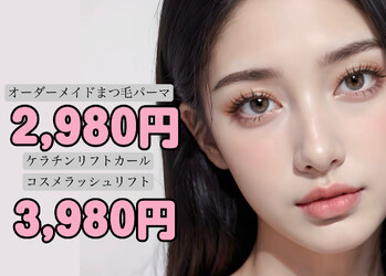 第一印象を決めるまつ毛と眉毛はプロにお任せください。高い知識と技術でお悩みに応じた施術メニューをご提案いたします。ダメージレスな施術と持ちの良さから大人女子にも高評価のサロンです♪イベントやブライダルにもしっかり対応しております。 【まつ毛メニュー】フラットラッシュ・BINDLOCK・エアリーボリュームラッシュ・クローバーフラット・カラーエクステ各種・上下マツエク・下向きまつ毛を上向きに固定する「アジャストラッシュ」・まつ毛の育毛アディクトラッシュケア・次世代まつ毛パーマ「パリジェンヌラッシュリフト」・ケアまつ毛パーマ・上下まつ毛パーマ 【眉毛メニュー】・ハリウッドブロウリフト・Wax脱毛・スタイリングWax脱毛・メンズアイブロウWAX(電話予約のみ対応) 【取扱いアイテム】ラッシュアディクトeyelashselum・omeme・アイラッシュリポゾーンプレミアム・アイラッシュリポゾーン・V3ファンデーションⅰ ⅱ ⅲ ⅳ・SPCARE・PallisBLOW・プラチナムアイズ