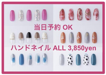 まつげエクステとネイルの同時施術可能◎女性に嬉しいプライベート空間♪スカルプオフはなんと3000円!お得な定額コースもございます♪カラーやデザイン、ネイルパーツの種類も豊富!ストーンを使ったかわいいデザインも◎シンプルに仕上げたい方にはジェルネイルのプランもおすすめです♪夜~21時まで営業!ハンドとフットの同時施術もOK!お仕事で忙しい方にも嬉しいサロンです♪