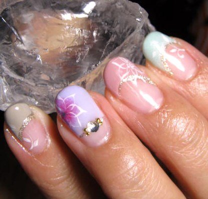 大人の魅力が溢れるダスティパステルとフラワーアート。斜めフレンチにはラメのラインを施しましょう。仕事運&金運UPのお手伝いをしてくれますよ!金運UPにおすすめなキラキララメは、ダスティパステルと組み合わせれば上品な仕上がりになりますね。