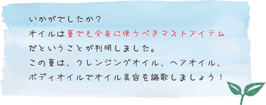 この夏はオイル美容ブームだということをご存知ですか?クレンジングオイル、ヘアオイル、そしてボディオイルと 、オイルアイテムが続々と登場しています。そう 、夏のオイル使いといえば、タンニングと思われがちですが(笑) 、実は今、ビューティアップに欠かせないアイテムとして 、オイルが美容感度の高い女子に注目されています。何となく肌色が曇る、髪がパサつく…など、夏トラブルの救世主となる最新オイル情報をお届けします。