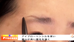 アイブロウペンシルで眉山が高い眉毛を描く。