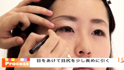目を開けて、目尻側が少し長くなるようにリキッドアイライナーを引く。