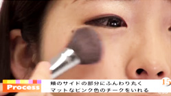 頬のサイドにマットなピンク色のチークをふんわりと丸く入れる。