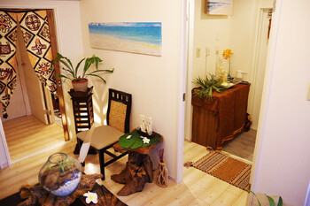 緑あふれる新宿御苑を望むマンション内サロン。店名の「Hale」はハワイ語で家、「lehua」はハワイの花を意味する。「晴れ」と同じ響きを持つことから、“気持ちも体も晴れ晴れとして元気になってもらいたい”、という思いも込められている。木の温もりと白を基調とした空間に包まれて、ハワイ伝統のロミロミの技を堪能して。