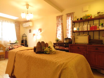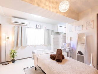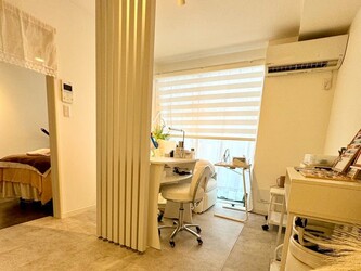 白を基調とした清潔感あふれるサロン内に、南向きの窓から差し込む日差しが爽やか。ベッドルームはゆったりとしたスペースを確保し、アロマ香るリンパマッサージとともに心の奥底からリラックスできる時間を提供してくれる。