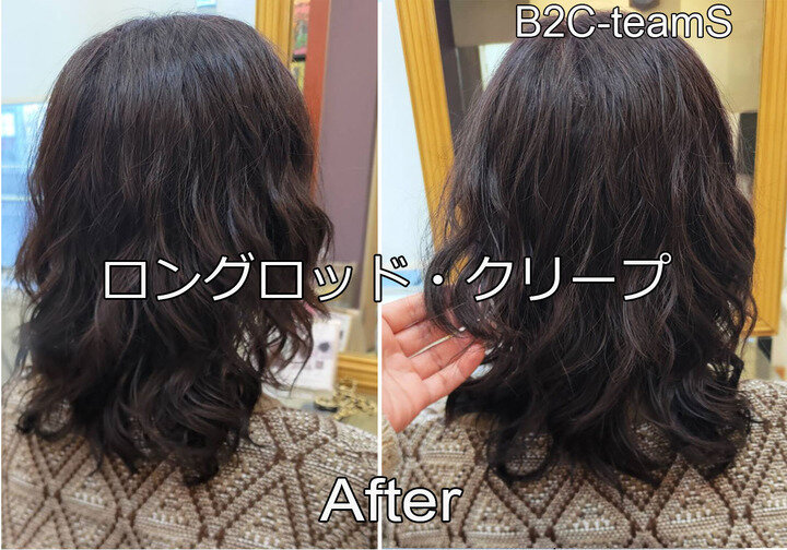 根元の健康部と毛先のダメージ部に違う薬剤で施術を施します。髪が乾いた後のウェーブを計算してかけますので、1回転ずつ仕上がりをイメージして巻き込み位置や角度を決めます。髪の弾力を損ねるアルカリ剤は一切使用しません。さらに長持ちを狙うためデジタル、またはクリープ技術をつかってカールをしっかり定着させます。毛先のカールと根元のウェーブを各々に設計して形づくりを行うため、仕上がりに対するお手入れはほとんど不要にすることを目標にしています。ミディアムやロングでも指に巻き付けて乾かす必要もありませんし、ショートは洗いざらしでも自然乾燥でも仕上がるように施術いたします。