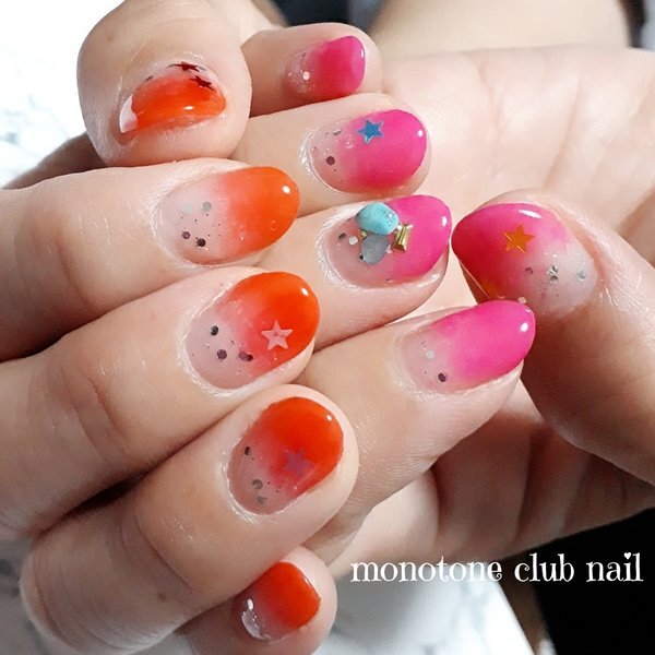 挑戦してみたいけれど、意外と使いどころが難しいのがネオンオレンジ。明るくて元気な印象になりやすいので、オトナ女子には避けられがちです。でもそんな個性派カラーも、グラデーションにしてしまえば一気にきれいめデザインに大変身。根元にのぞくクリアな部分が抜け感をつくり出し、指を美しく見せてくれます。